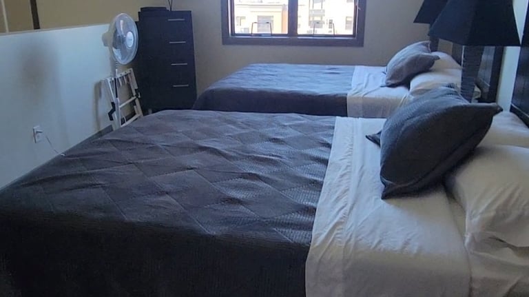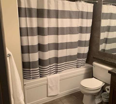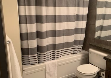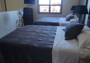 This upper loft has two queen beds and a 37" TV mounted on the wall. Both beds have the ability to store luggage underneath to decrease clutter. On this level is also a Full bathroom with bathtub.