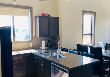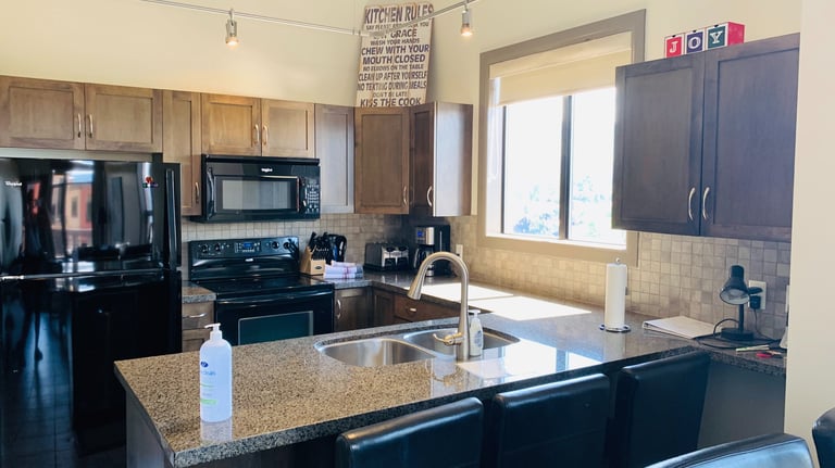 This kitchen comes fully stocked with all the things you would normally use in your own house. The fridge has a water/ice dispenser on the door for quick use. Just bring your food and enjoy.