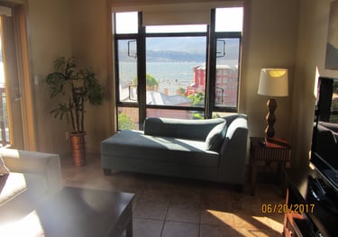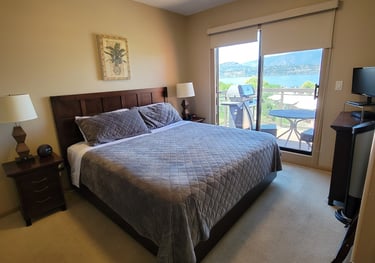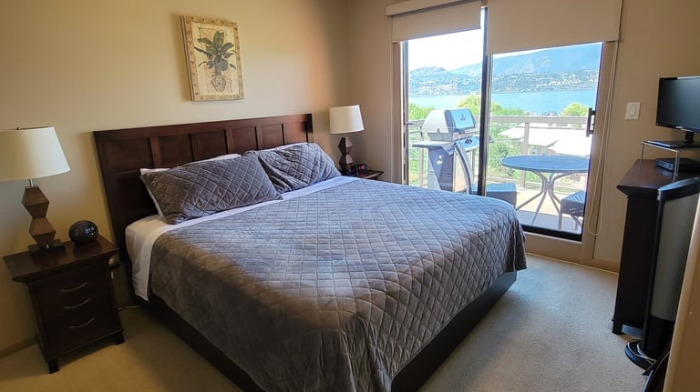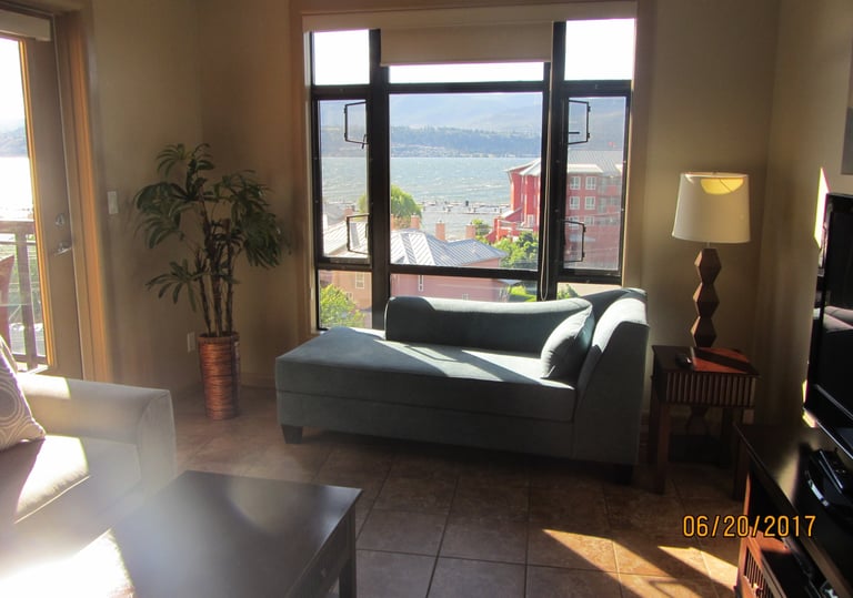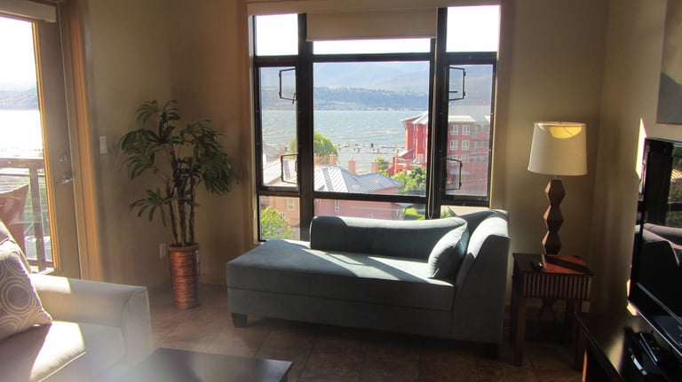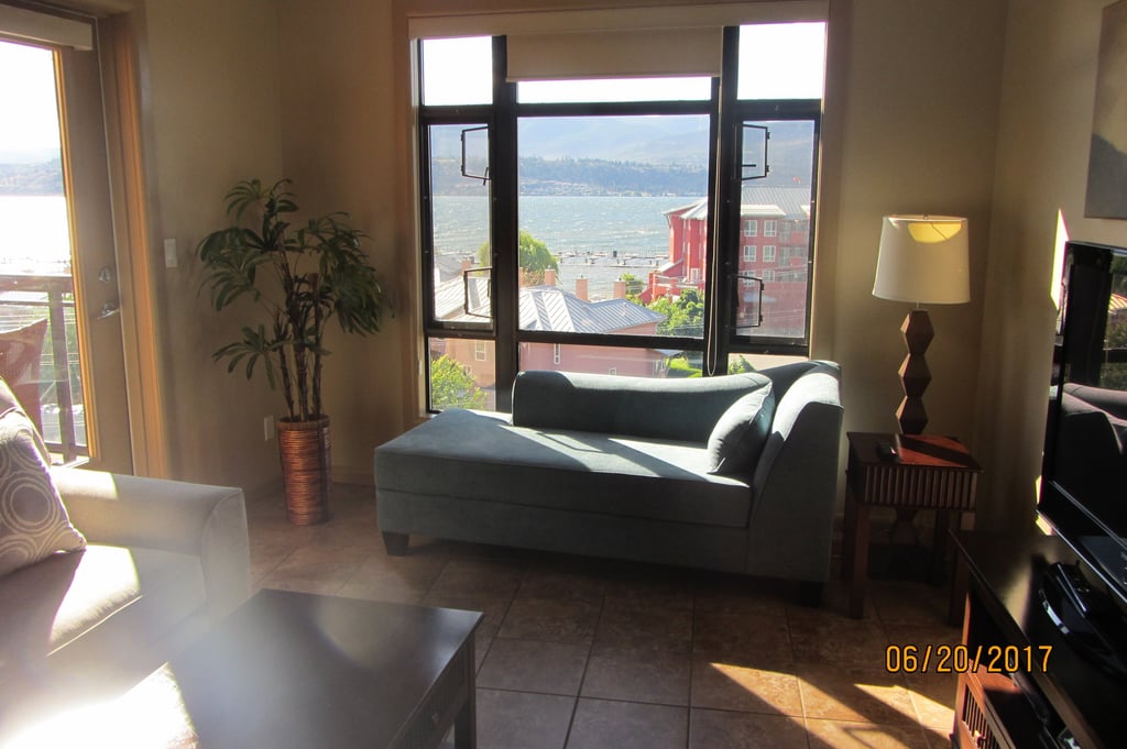Lay on the chaise with awesome views out to the lake, relaxing is Key while in Kelowna